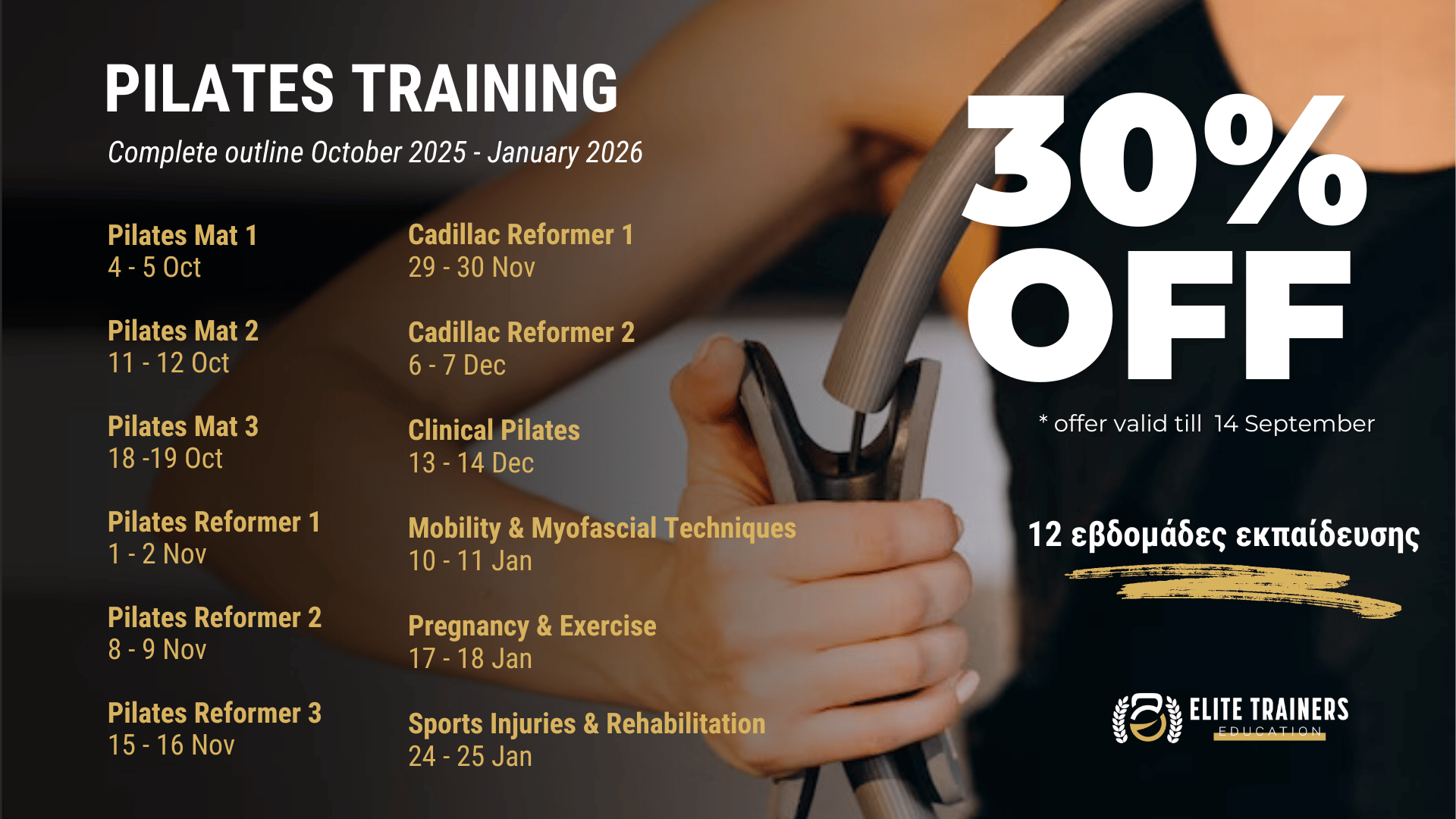 Μάθετε τις ξεχωριστές αρχές του Pilates, αναβαθμίζοντας τις υπηρεσίες σας τόσο στην καθοδήγηση ομαδικού μαθήματος σε γυμναστήρια & studio, όσο και σε εξατομικευμένο επίπεδο σαν personal trainers.